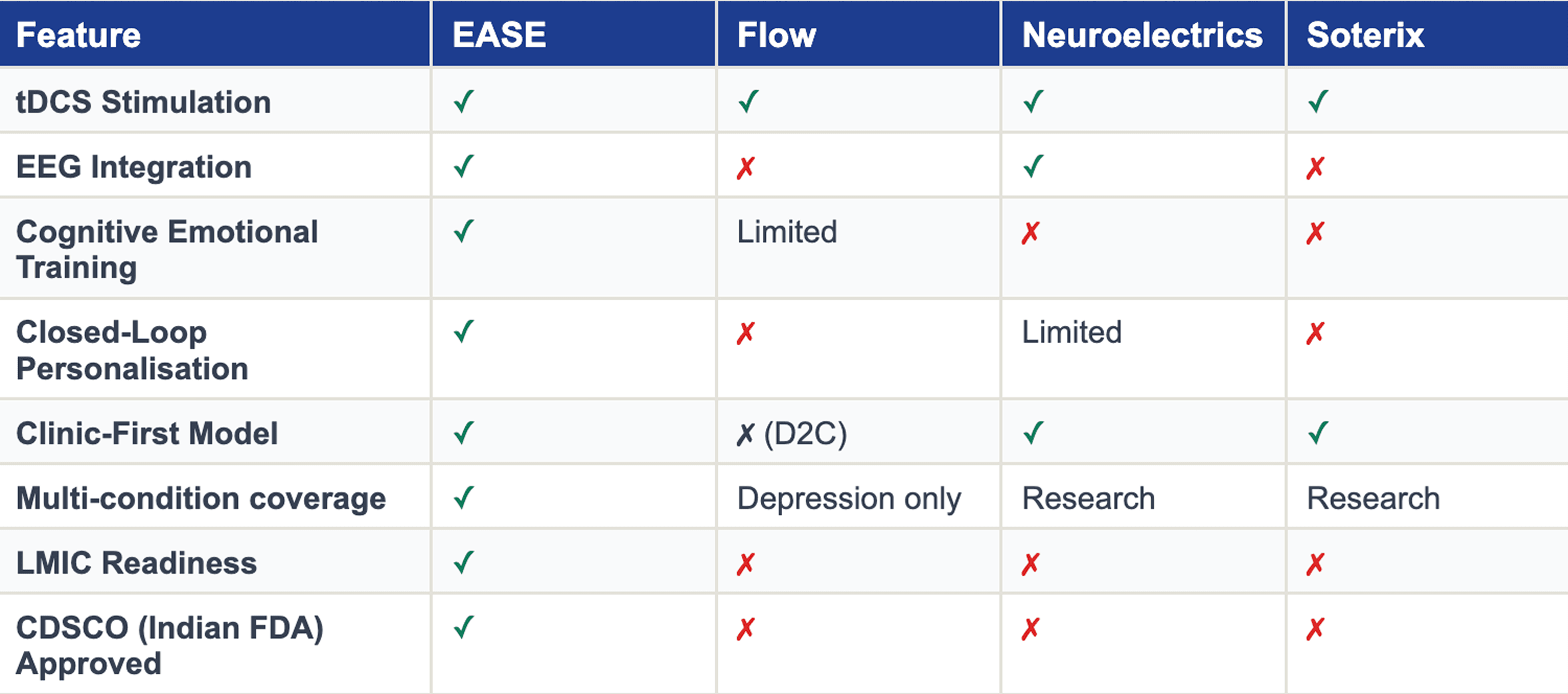 Here is how EASE compares to the three most significant global players in the tDCS space.